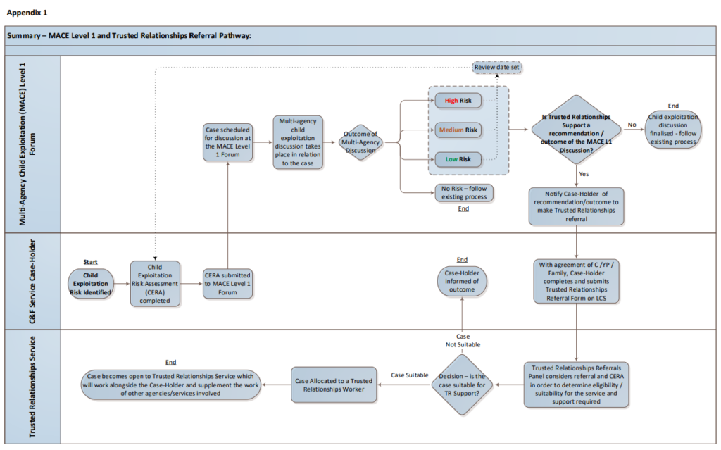 regarding the risk management and the contextual safeguarding concerns around the child. The MACE Level 1 forum also makes recommendations in relation to the case, and Trusted Relationships will be considered as one potential support option. If an outcome of the MACE discussion is that the case would be suitable for and would benefit from Trusted Relationships support, the case-holder will be asked to consider making a referral to ensure the young person