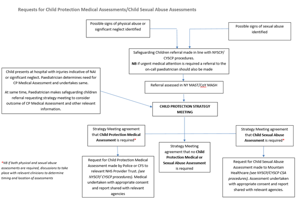 Either the Police or Children’s Social Care can request a child protection medical assessment. The assessment should be arranged with the nearest acute provider of paediatric services.